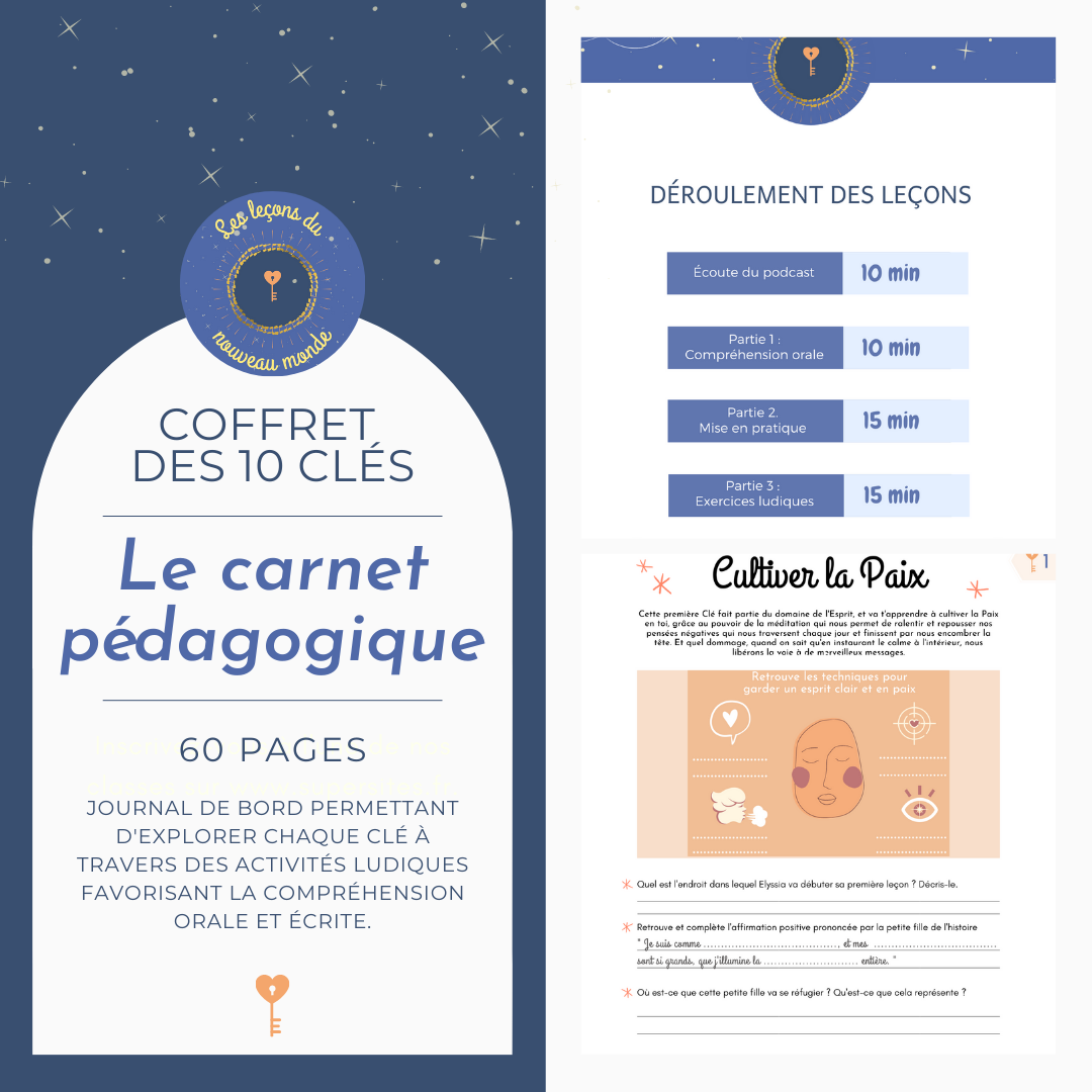 Un carnet pédagogique de 60 pages à utiliser comme un journal de bord qui les suivra tout au long de l’écoute du Podcast. Chacun peut l’imprimer, y noter son nom pour se l’approprier. Il est recommandé de faire les exercices après avoir écouté l’audio, pour bien intégrer la leçon, mais il n’y a aucune obligation, il s’agit d’un outil à utiliser le plus librement possible selon les envies et besoins des enfants.