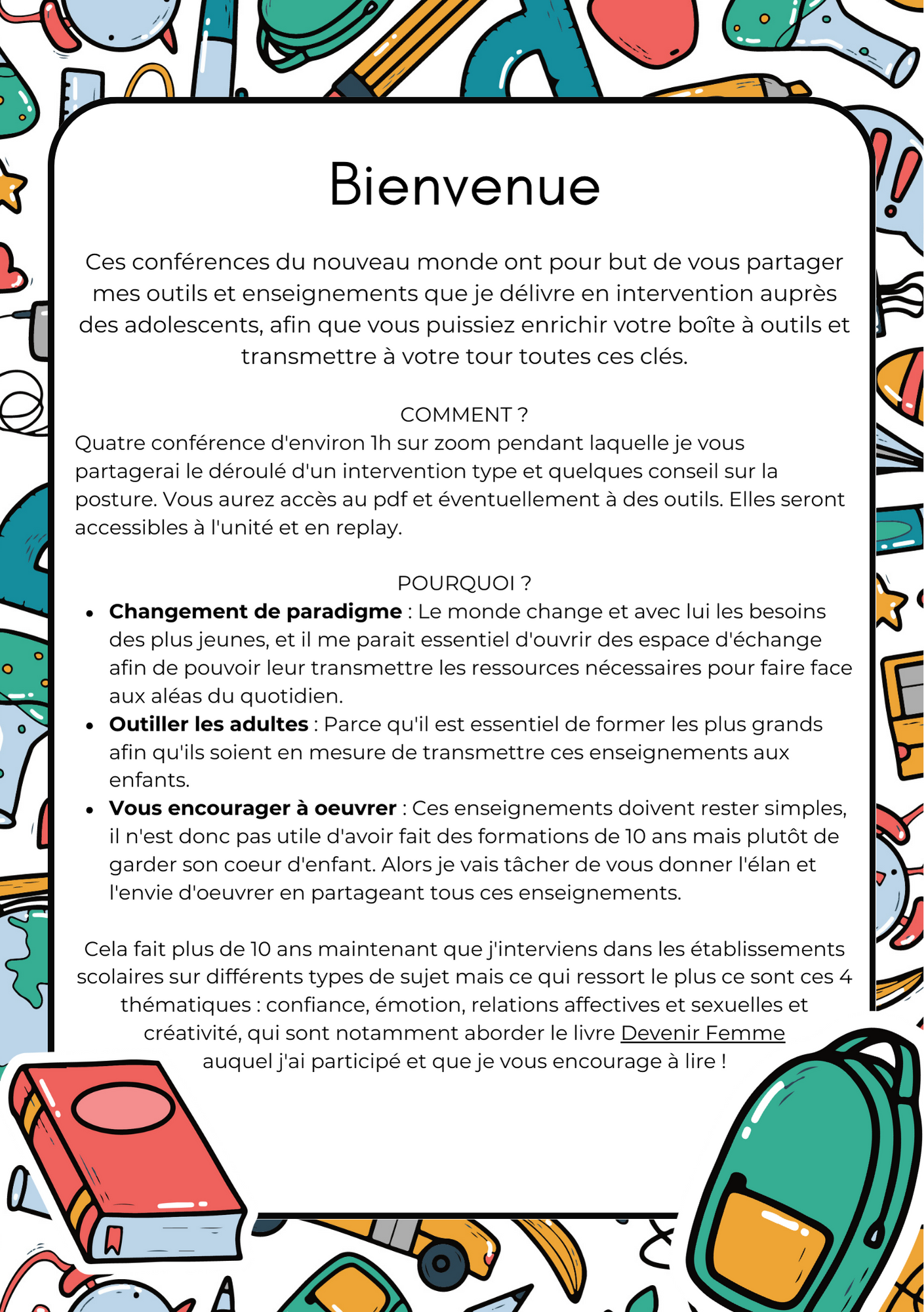 Ces conférences du nouveau monde ont pour but de vous partager mes outils et enseignements que je délivre en intervention auprès des adolescents, afin que vous puissiez enrichir votre boîte à outils et transmettre à votre tour toutes ces clés.